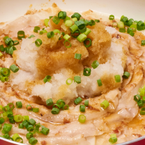 ①ボウルに『リケンのノンオイル 青じそ』・おろしにんにく・オイスターソース・『素材力だし 本かつおだし』・ごま油を入れて混ぜ合わせる。