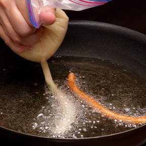 ④フライパンにサラダ油入れて熱したら、③を20~30㎝程度に絞り出して揚げる (170℃2分~途中上下を返す)。