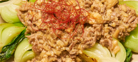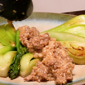蒸し焼きにした青梗菜に、豚ひき肉とえのき茸で作った肉そぼろをかけた一品です。