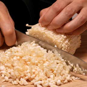 ③②におろしにんにく・おろししょうが・えのき茸を加えて炒める。『リケンのノンオイル 青じそ』を加えて炒める。片栗粉・水を混ぜ合わせて加え、さらに炒める。