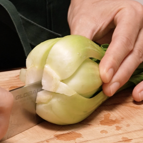 ①チンゲン菜を根元の部分が十字になるように1株を4等分に切る。