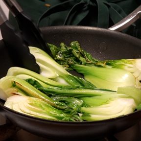 ②フライパンにチンゲン菜を並べ、ごま油(大さじ1/2)を回しかける。ふたをして2分蒸し焼きにし、一度裏返しさらに2分焼き、器に盛り付ける。