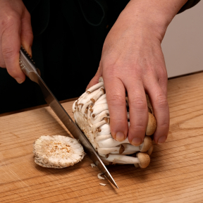 ①しめじはほぐさないように石づきを切る。