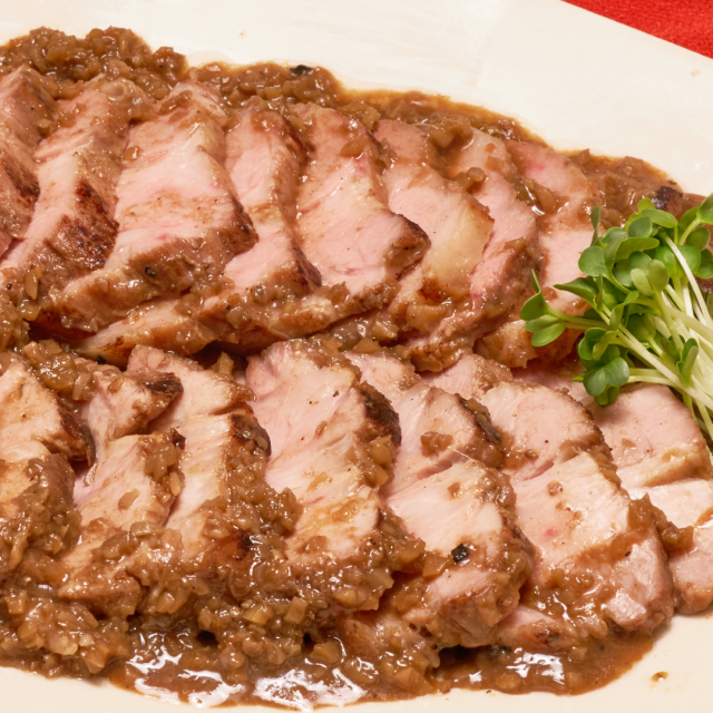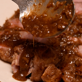 ⑦お好みの幅にスライスしたら器に盛り、タレをかける。
