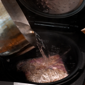 ③炊飯器にしっかりと空気を抜いた②・浸かる程度の熱湯を入れたら蓋をして保温する(4時間)。