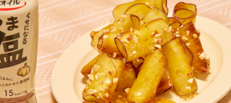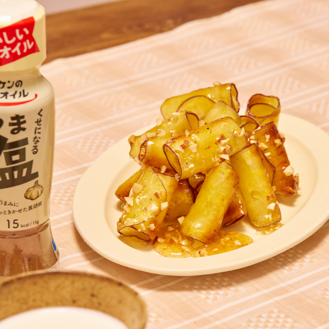 『リケンのノンオイル くせになるうま塩』を使った甘じょっぱい蜜を絡めることで、後をひくおつまみ感覚の一品になります♪