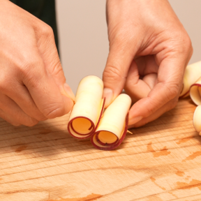 • ②①の水分をとり、1枚ずつ筒状に巻き、つまようじで刺してとめる。