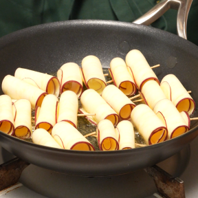 • ③フライパンに2cm程度の油を熱し、②を色づくまで揚げ焼きする。粗熱がとれたらつまようじを外す。