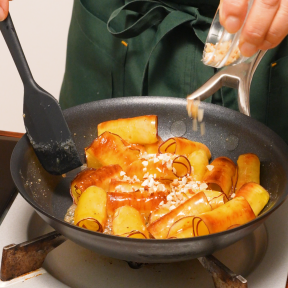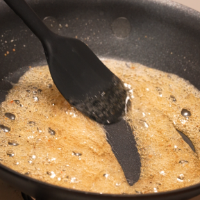 • ④別のフライパンに砂糖・はちみつ・『リケンのノンオイル くせになるうま塩』を入れ、とろみがつくまで煮詰める。