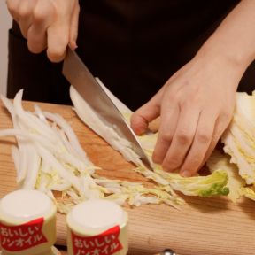 ①白菜は縦に5mm程度の幅に細長く切る。