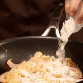 ③②の白菜がしんなりとし、水分が飛んだらエビを入れてサッと炒め合わせる。