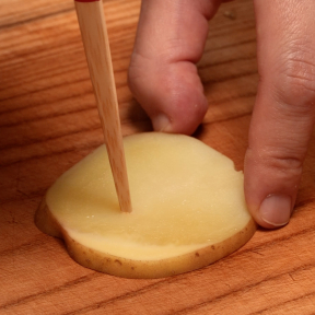②粗熱が取れた①を7mm程度の輪切りにし、菜箸等で2,3か所穴をあける。