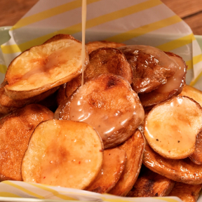 外側はガリっと中はホクホクのじゃがいもに、熱々のくせになるガリバタソースを回しかけたやみつきになるメニューです!