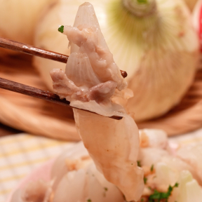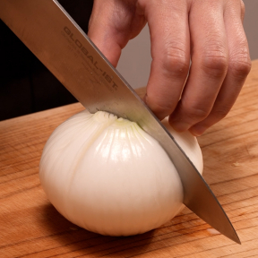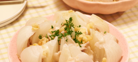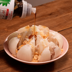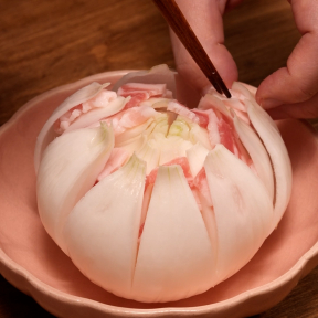 ①新玉ねぎは根本まで切らずに8~12等分のくし形になるよう切り目を入れ広げる。