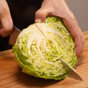 ①キャベツは芯をつけたまま半分に切る。