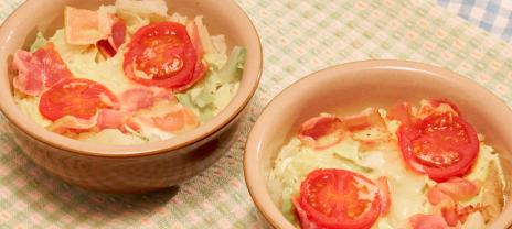 • ②キャベツは1cm幅に、ベーコンは2cm幅に切り、ラップをかけ、電子レンジで加熱をする(600W1分30秒~)。