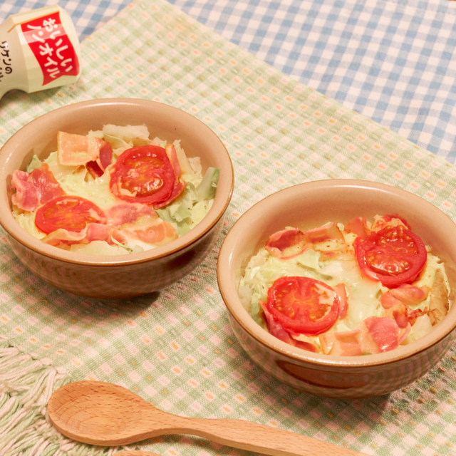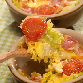 具にやわらかな春キャベツをたっぷり使い、野菜を楽しめるキッシュ風温野菜です!