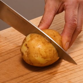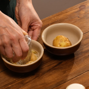 新じゃがを皮ごと加熱し、つぶしてキッシュの皮代わりに使います。