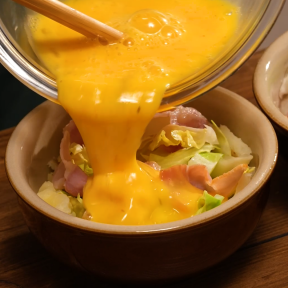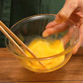 • ④卵を溶き、牛乳・『リケンのノンオイル くせになるうま塩』を加えて混ぜ合わせる。