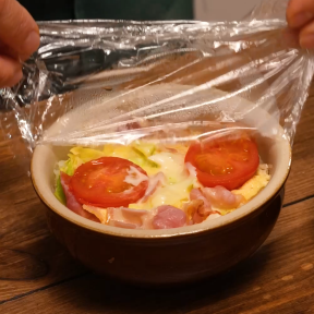 • ⑥ラップをかけ、電子レンジで加熱をする(600W1分30秒~)。焼き目がほしい時は更にトースターで約3分焼く。