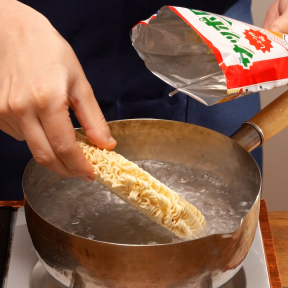 ①「サッポロ一番」は表示より1分短くゆで、冷水でしめたらしっかりと水気をきる。