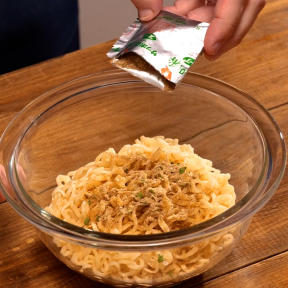 ②①に「サッポロ一番」の添付スープを1/2袋ふりかけて絡めておく。