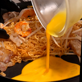 ④サラダ油を熱したフライパンでバナメイえび・豚バラ肉を焼き、火が通ったらもやし・②を入れて炒める。